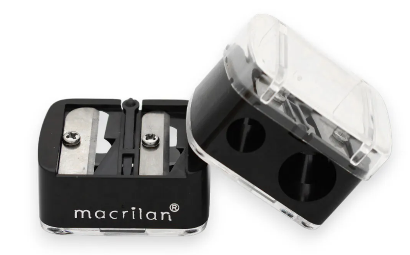 Apontador com tampa coletora, espátula de limpeza e 2 tamanhos de furos. Para lápis para olhos, lápis labial e lápis sombra.